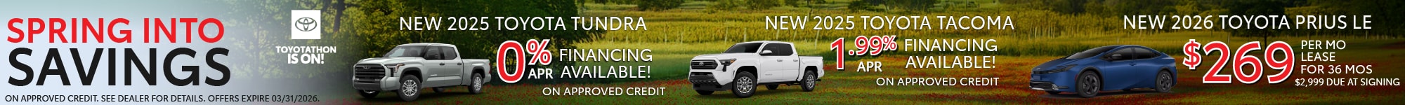 • Qualify for $500 through the Military Rebate Program on the finance or lease of a select new Toyota. Military: $500 rebate offered by Toyota Motor Sales, U.S.A., Inc. and may be applied toward finance or lease contracts on new 2024 4runner, 2024 bz4x, 2024 camry, 2024 camryhybrid, 2024 corolla, 2024 corollacross, 2024 corollacrosshybrid, 2024 corollahatchback, 2024 corollahybrid, 2024 gr86, 2024 grandhighlander, 2024 grandhighlanderhybrid, 2024 grcorolla, 2024 grsupra, 2024 highlander, 2024 highlanderhybrid, 2024 landcruiser, 2024 prius, 2024 priusprime, 2024 rav4, 2024 rav4hybrid, 2024 rav4prime, 2024 sequoia, 2024 sienna, 2024 tacoma, 2024 tacomahybrid, 2024 toyotacrown, 2024 tundra, 2024 tundrahybrid, 2024 venza, 2025 4runner, 2025 4runnerhybrid, 2025 bz4x, 2025 camry, 2025 corolla, 2025 corollacross, 2025 corollacrosshybrid, 2025 corollahatchback, 2025 corollahybrid, 2025 gr86, 2025 grandhighlander, 2025 grandhighlanderhybrid, 2025 grcorolla, 2025 grsupra, 2025 highlander, 2025 highlanderhybrid, 2025 landcruiser, 2025 mirai, 2025 prius, 2025 priuspluginhybrid, 2025 rav4, 2025 rav4hybrid, 2025 rav4pluginhybrid, 2025 sequoia, 2025 sienna, 2025 tacoma, 2025 tacomahybrid, 2025 toyotacrown, 2025 toyotacrownsignia, 2025 tundra, 2025 tundrahybrid, 2026 4runner, 2026 4runnerhybrid, 2026 bz, 2026 bzwoodland, 2026 camry, 2026 chr, 2026 corolla, 2026 corollacross, 2026 corollacrosshybrid, 2026 corollahatchback, 2026 corollahybrid, 2026 gr86, 2026 grandhighlander, 2026 grandhighlanderhybrid, 2026 grcorolla, 2026 grsupra, 2026 highlander, 2026 highlanderhybrid, 2026 landcruiser, 2026 mirai, 2026 prius, 2026 priuspluginhybrid, 2026 rav4, 2026 rav4pluginhybrid, 2026 sequoia, 2026 sienna, 2026 tacoma, 2026 tacomahybrid, 2026 toyotacrown, 2026 toyotacrownsignia, 2026 tundra, 2026 tundrahybrid through participating Toyota Dealers and Toyota Financial Services, dated from 03-03-2026 through 03-31-2026. To qualify for the rebate, at the time of purchase or lease you must be (1) In current active duty status in the U.S. military (Navy, Army, Air Force, Marines, National Guard, Coast Guard and active Reserve) OR a U.S. military inactive reserve (i.e., Ready Reserve) that is part of the individual Ready Reserve, Selected Reserve and Inactive National Guard; OR a retiree of the U.S. military, OR a U.S. military veteran within two years of their discharge date; OR a spouse/ surviving spouse and dependents of an eligible U.S. Military personnel including Gold Star Family Members; AND (2) provide verifiable proof of military status or active service; or retired via an ID.me account and complete the verification process at a participating Toyota dealer; (3) receive credit approval from and execute a finance or lease contract through Toyota Financial Services at participating Toyota dealers.. Not all applicants will qualify. On lease contracts, rebate must be applied toward the Amount Due at Lease Signing or toward the Capitalized Cost Reduction. On finance contracts, rebate must be applied toward the Down Payment. Limit one rebate per finance or lease transaction per eligible U.S. military personnel or eligible household member. Offer not combinable with the College Rebate Program, and the Lease-End Refi Program. Vehicle must be taken out of dealer stock. Terms, conditions and restrictions apply. Program is not available in AL, FL, GA, HI, NC, and SC. Rebate terms may be more generous in your local area. Ask your participating dealer about the military rebate terms in your area. Must pay sales tax. Void where prohibited by law. Not redeemable for cash. Ā©2026 Toyota Financial Services. All rights reserved. Toyota Financial Services is a service mark used by Toyota Motor Credit Corporation (TMCC). Retail installment accounts may be owned by TMCC or its securitization affiliates and lease accounts may be owned by Toyota Lease Trust (TLT) or its securitization affiliates. TMCC is the servicer for accounts owned by TMCC, TLT, and their securitization affiliates.