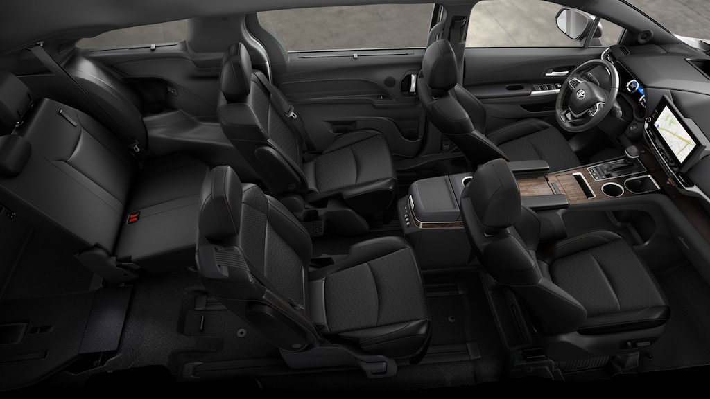 - 7-passenger seating with heated premium leather-trimmed second-row-seat captain's chairs with super-long-slide feature and ottomanssienna_ottomansienna_ottoman].Do not recline the seat when vehicle is in motion. Reclining the seat might negatively affect the fit of the seatbelt and increase the risk of death or serious injury. See. Owner’s manual. For limitations.,When spare tire is added to limited awd, platinum awd or 25th anniversary edition awd, second-row ottomans are removed.