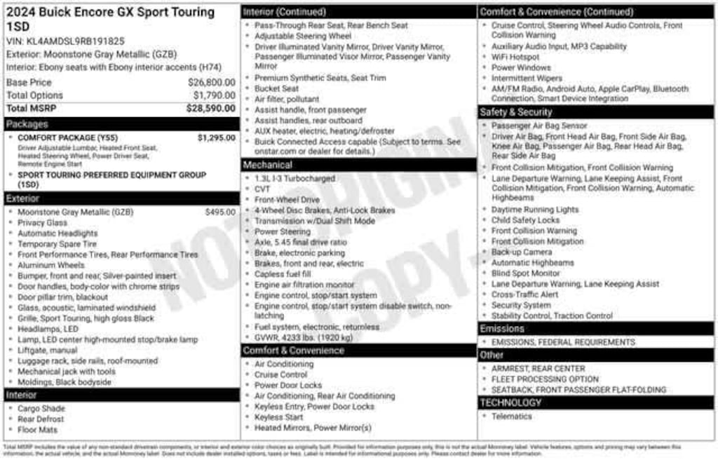 Rear Air, Back-Up Camera, Satellite Radio, iPod/MP3 Input, Onboard Communications System. Buick Sport Touring with Moonstone Gray Metallic exterior and Ebony seats with Ebony interior accents interior features a 3 Cylinder Engine with 155 HP at 5600 RPM*.