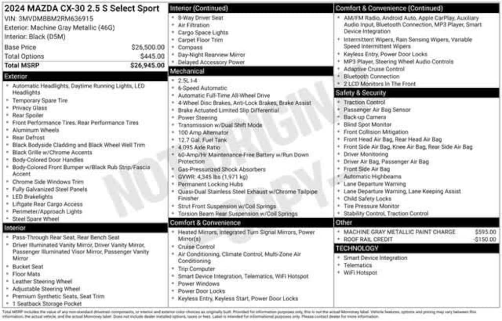 All Wheel Drive, Back-Up Camera, iPod/MP3 Input, Onboard Communications System, Aluminum Wheels Mazda CX-30 2.5 S Select Sport with Machine Gray Metallic exterior and Black interior features a 4 Cylinder Engine with 191 HP at 6000 RPM*.